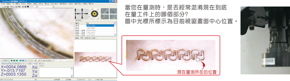 藉由電腦判定每次的對焦面,以保證變換焦距時測量的重現性及精準度。自動對焦採集數據可調整對焦速度與對焦精度。並可利用自動對焦功能進行高度、深度及平面度之量測作業。 |